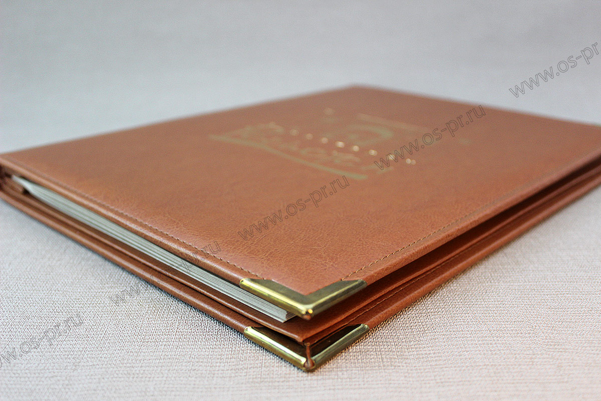 На фото мы показываем нашу работу. Традиционные папки меню. Переплетный кожанный материал, золотое тиснение, золотые уголки.